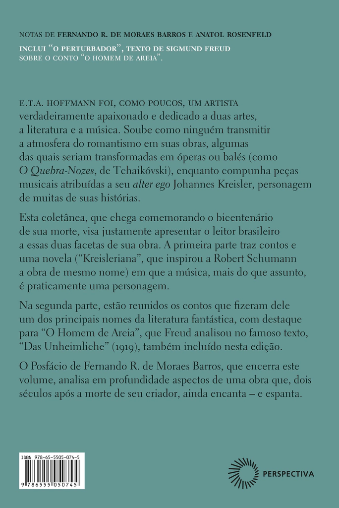 Conhecemos o E.T.A. Hoffmann autor de contos e romances fantásticos e de terror. Pouco sabemos, porém, de sua ligação estreita com a música, ele mesmo tendo sido também compositor. Este livro traz ao leitor uma extraordinária sincronia do escritor de textos fantásticos e do amante da música, reunindo, em sua primeira parte, contos e novela que têm a música como eixo, depois complementado em Posfácio por um ensaio do organizador do volume sobre o entrelaçamento dos dois campos na obra do autor. Na segunda parte, o célebre “O Homem de Areia”, acompanhado em Apêndice do famoso texto de Sigmund Freud comentando-o, e outros contos importantes dão um painel do brilho de sua produção.