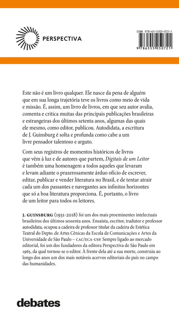 No centenário do nascimento do editor, DIGITAIS DE UM LEITOR é uma conversa de leitor para leitor em uma jornada pela literatura brasileira e estrangeira de muitas décadas. Autores que desapareceram deixando obras monumentais, outros que surgiram com prosa e desenvolvimento originais e ainda outros recuperados pela memória, ressurgidos porque ressoam os tempos atuais. A mestria, o livre pensar e a paixão pela literatura emanam da escritura de J. Guinsburg, com erudição, alegria e talento.