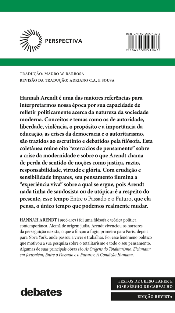 Hannah Arendt é uma das maiores referências para interpretarmos nossa época por sua capacidade de refletir politicamente acerca da natureza da sociedade moderna. Conceitos e temas como os de autoridade, liberdade, violência, o propósito e a importância da educação, as crises da democracia e o autoritarismo, são trazidos ao escrutínio e debatidos pela filósofa. Esta coletânea reúne oito “exercícios de pensamento” sobre a crise da modernidade e sobre o que Arendt chama de perda de sentido de noções como justiça, razão, responsabilidade, virtude e glória. Com erudição e sensibilidade ímpares, seu pensamento ilumina a “experiência viva” sobre a qual se ergue, pois Arendt nada tinha de saudosista ou de utópica: é a respeito do presente, esse tempo Entre o Passado e o Futuro, que ela pensa, o único tempo que podemos realmente mudar.