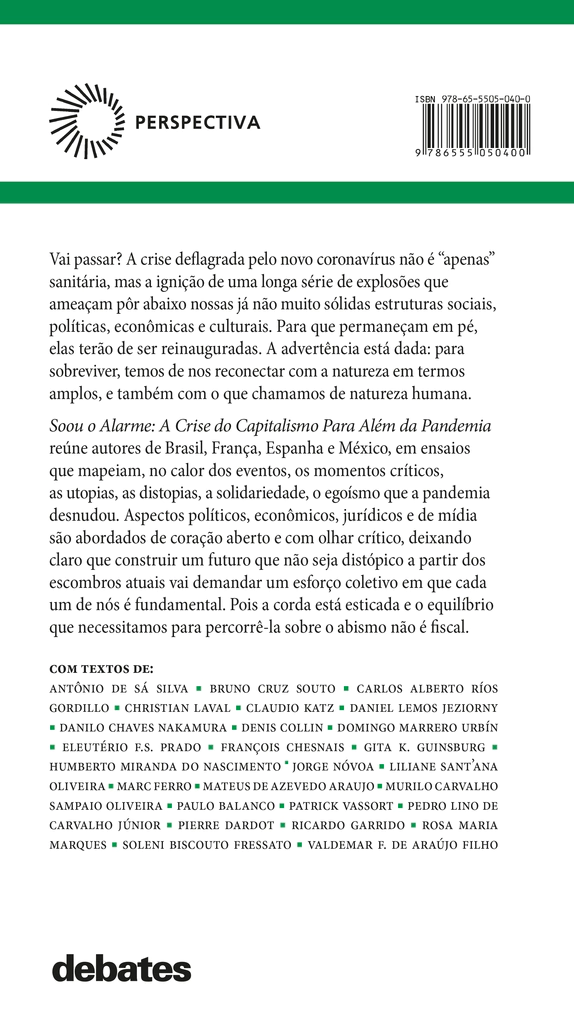 Soou o Alarme: A Crise do Capitalismo Para Além da Pandemia reúne autores de Brasil, Argentina, França, Espanha e México, em ensaios que mapeiam, no calor dos eventos, os momentos críticos, as utopias, as distopias, a solidariedade, o egoísmo que a pandemia desnudou.